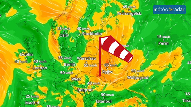 De la Scandinavie jusqu'à la mer Noire, un vent du nord-ouest d'une force inhabituelle souffle. Localement, on observe des rafales pouvant atteindre près de 80 km/h.