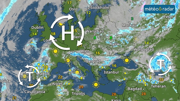 La carte montre la situation météorologique générale actuelle. Un anticyclone au-dessus de l'Europe centrale est flanqué de deux dépressions.