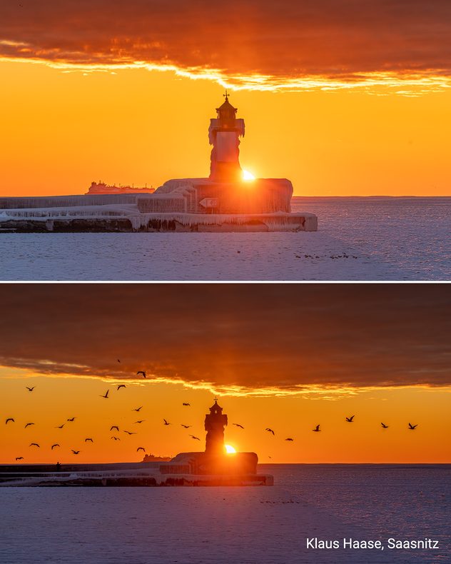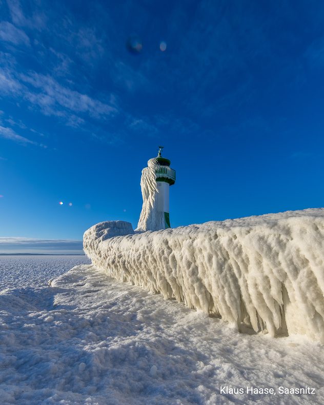 Un emblème dans un état d'urgence. Du côté exposé aux vagues du phare de Sassnitz, sur l'île de Rügen, les embruns gelés ont donné naissance à des formes de glace fascinantes.