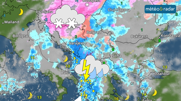 Une forte dépression provoque un temps assez maussade avec de fortes précipitations depuis l'Adriatique jusqu'à la mer Noire. Selon les régions, il y aura de la neige, de la pluie, du grésil ou même des orages.