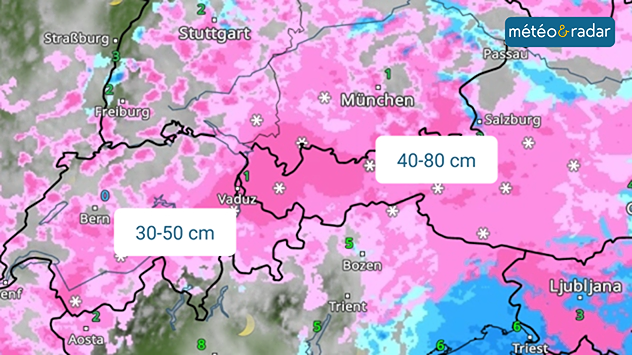 En altitude, d'importantes chutes de neige fraîche s'accumulent sur le versant nord des Alpes. De la région du Mont-Blanc jusqu'aux Grisons suisses, on enregistre généralement entre 30 et 50 centimètres, et jusqu'à 80 centimètres par endroits dans les Alpes autrichiennes. Dans les zones de barrage, l'épaisseur de neige peut même être nettement supérieure par endroits.