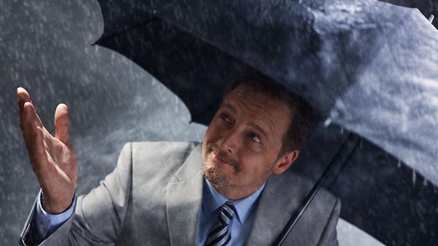 À gauche, une voiture sur une route inondée ; à droite, le radar météo qui annonce de fortes pluies.