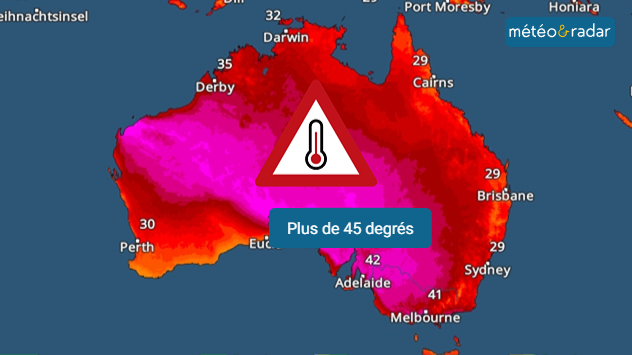 L'Australie connaît actuellement une vague de chaleur exceptionnelle. Les températures dépassent les 40 degrés dans de nombreuses régions, atteignant même localement 47 degrés. Une grande partie de l'intérieur du pays ainsi que l'Australie occidentale sont particulièrement touchés, et à partir de mercredi, le sud et le sud-est le seront également.